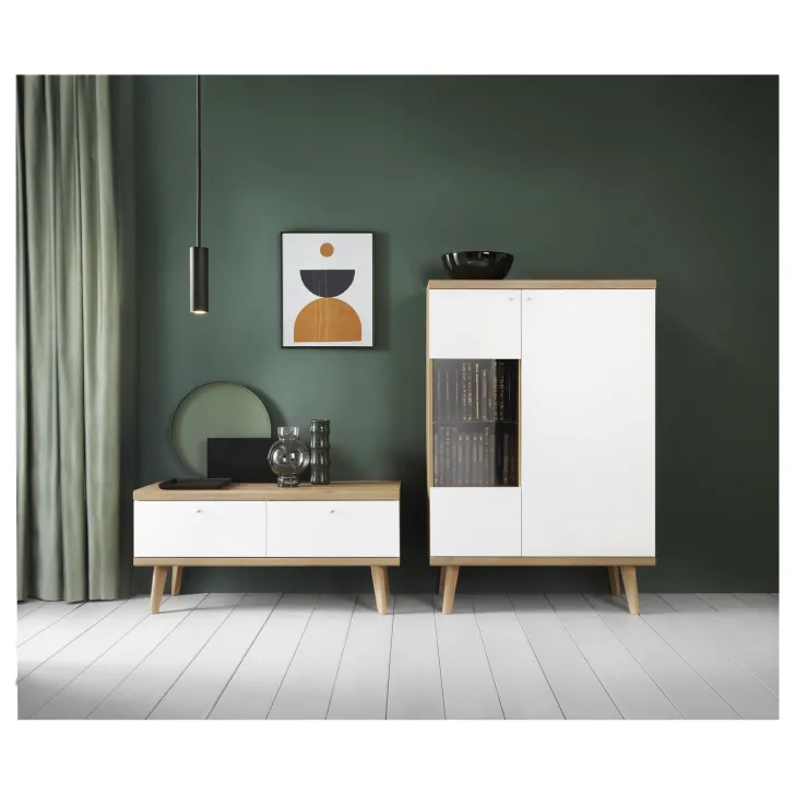 Der TV-Schrank OSLO verfügt über zwei geräumige Schubladen, in denen verschiedene Gegenstände wie DVDs, Zeitschriften oder Bücher ordentlich verstaut werden können. So bleibt dein Wohnzimmer stets aufgeräumt und stilvoll.
