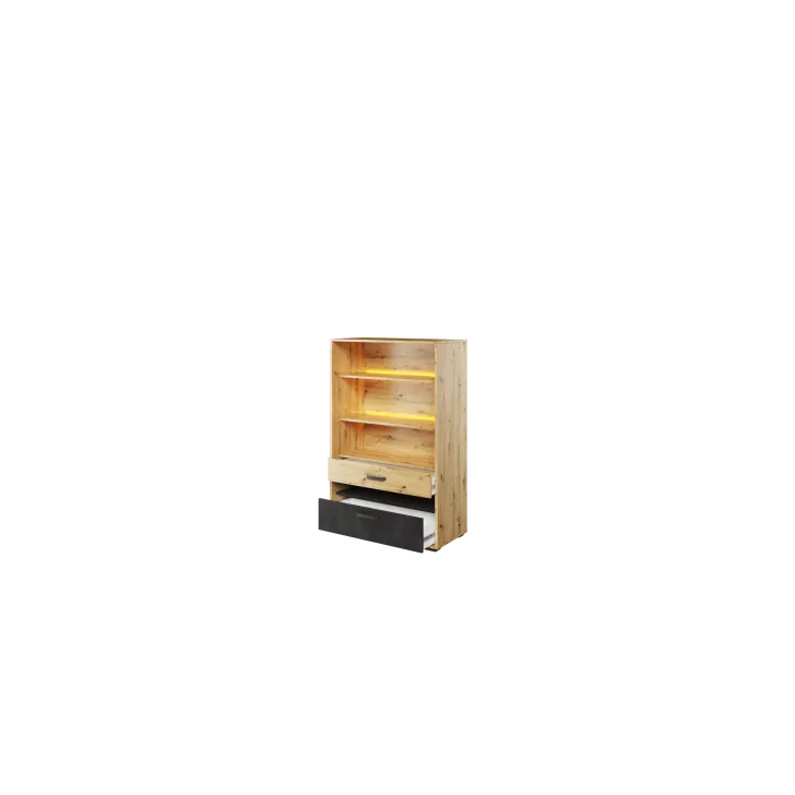 Möchten Sie Ihr Zuhause elegant und praktisch gestalten? Hier ist die perfekte Lösung für Sie – Regal mit zwei Schubladen QUBIC Eiche Artisan / Raw Steel / Silk Flou.