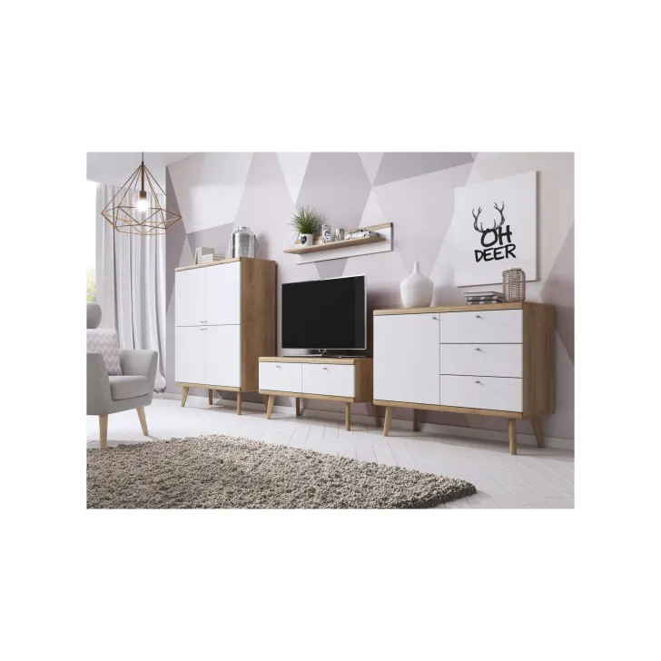 Das Regal über dem Fernseher OSLO Eiche Riviera/Weiß ist nicht nur eine praktische Lösung zur Aufbewahrung und Präsentation von Gegenständen im Wohnzimmer, sondern auch ein stilvolles Einrichtungselement. Dank der originellen Farbkombination aus Weiß und Eiche passt es perfekt in helle Wohnräume und verleiht ihnen Charakter und Eleganz. Das Regal besteht aus hochwertiger laminierter Platte, deren Kanten mit widerstandsfähigem ABS-Kunststoff versehen sind, was es besonders robust gegen Beschädigungen macht. Zierende Leisten aus MDF-Material sorgen zudem für ein besonderes Erscheinungsbild.