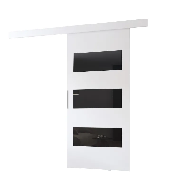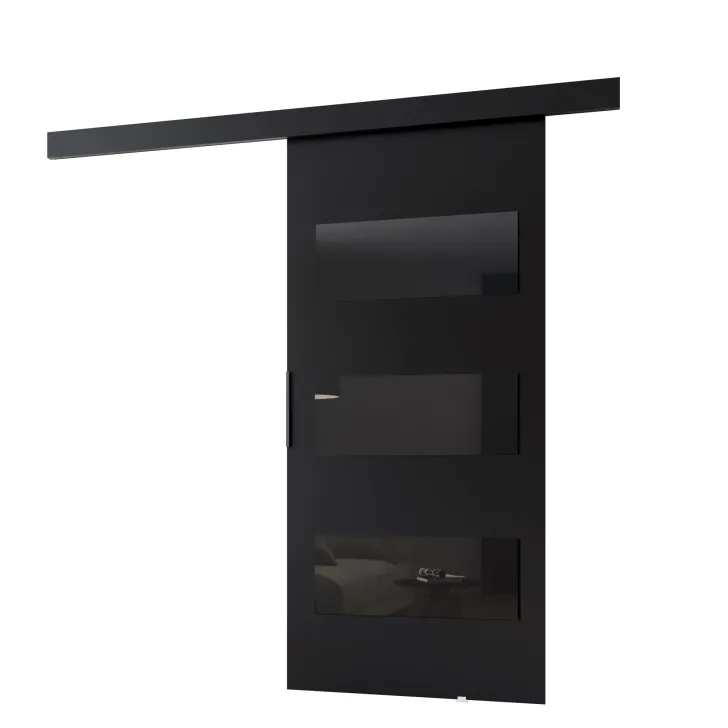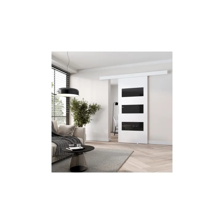 Erhältlich in einer breiten Farb- und Dekorauswahl, sind diese Schiebetüren die ideale Wahl für alle, die Individualität schätzen. Die Front ist mit eleganten schwarzen Dekor-Paneelen aus Lacobel-Glas versehen, die den Türen einen raffinierten Look verleihen.