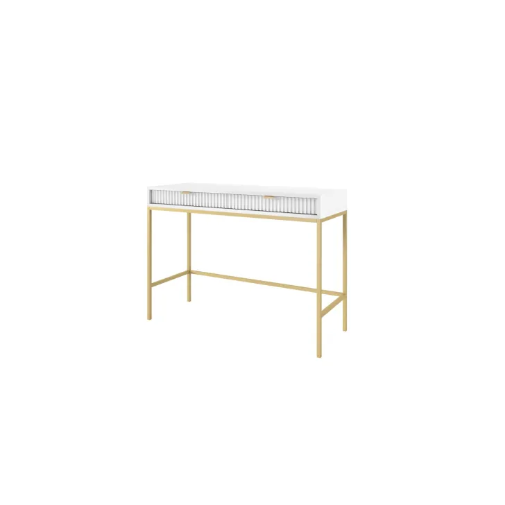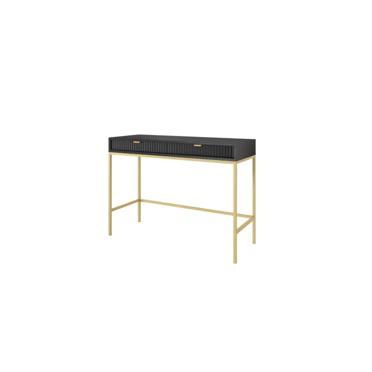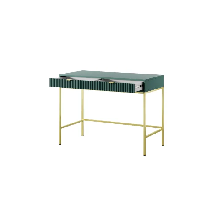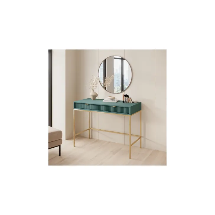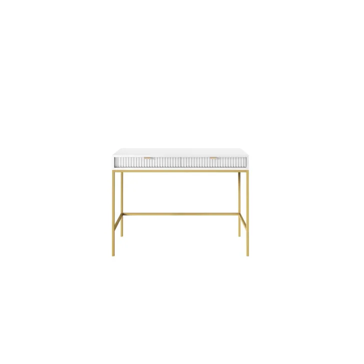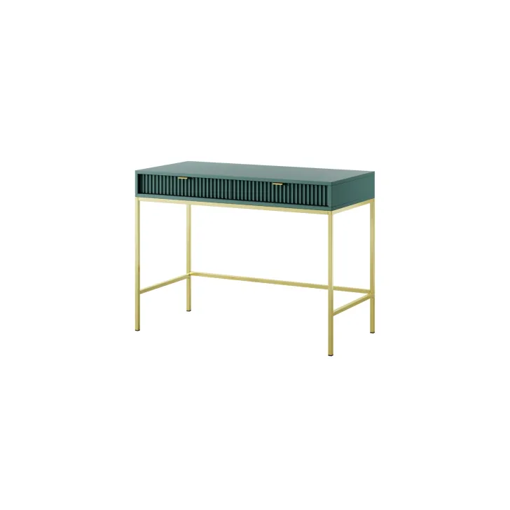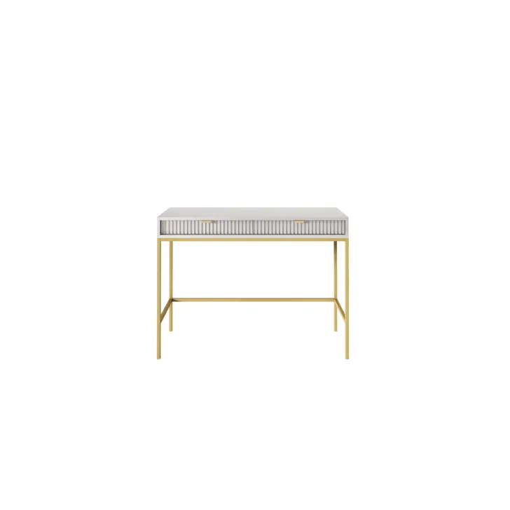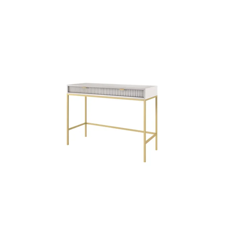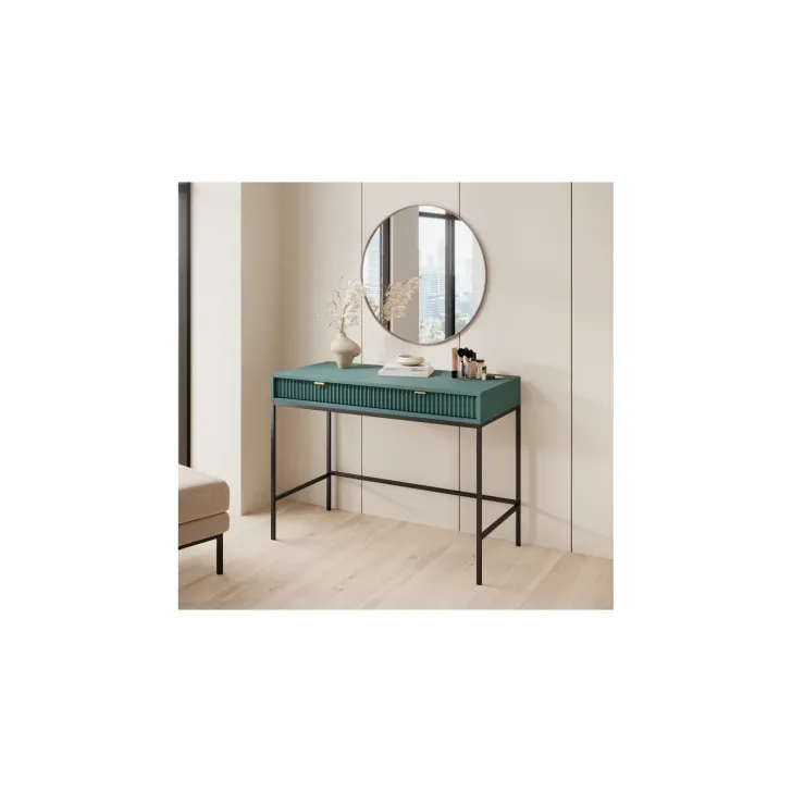 Entdecken Sie den faszinierenden Schminktisch NOVA – eine perfekte Kombination aus Stil, Funktionalität und Langlebigkeit. Dieses moderne Möbelstück lässt sich mühelos von einem stilvollen Schminktisch in einen funktionalen Schreibtisch verwandeln, was es zur idealen Wahl für Schlafzimmer oder Büro macht. Es handelt sich um ein universelles Möbelstück, das sich Ihrem Geschmack und Ihren Bedürfnissen anpassen lässt. Dank der Möglichkeit, Griffe und Beinfarben individuell zu gestalten, können Sie mit dem Schminktisch NOVA Ihren persönlichen Stil zum Ausdruck bringen. Wählen Sie aus fünf Farben (Weiß, Grau, Schwarz, Grün), zwei Beinfarben (Schwarz, Gold) und zwei Griffvarianten (Gold, Schwarz). Für die Herstellung des Schminktischs NOVA wurden ausschließlich hochwertige Materialien verwendet: