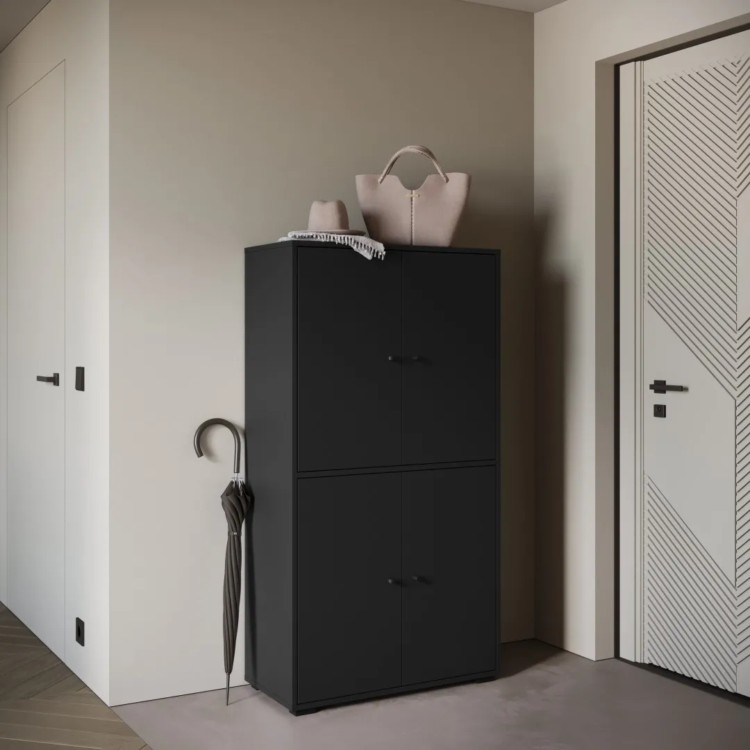 Die minimalistische Form in Kombination mit klassischen Farbtönen ist äußerst vielseitig und fügt sich mit Sicherheit perfekt in jedes Interieur ein. Kleine schwarze Punktgriffe an den vier symmetrischen Türen unterstreichen den modernen Charakter.