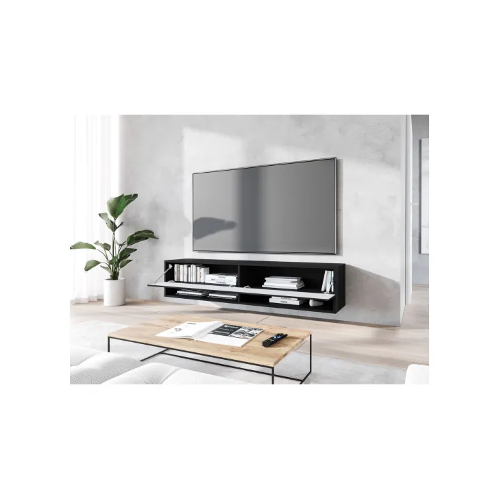 Die Verwendung einer 15 mm starken, laminierten Möbelplatte garantiert Langlebigkeit und Pflegeleichtigkeit. Die Fronten aus MDF in mattem Schwarzgrau mit 3D-Effekt verleihen dem Möbelstück ein modernes und elegantes Erscheinungsbild. Der TV-Schrank "ANNE" betont nicht nur den Stil des Raumes, sondern erfüllt auch alle praktischen Anforderungen – hinter seinen Klappen lassen sich Receiver, Konsolen oder andere Audio-/Videogeräte bequem verstauen.