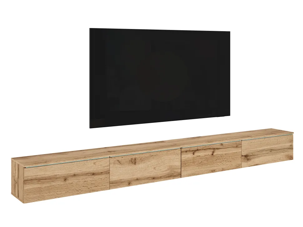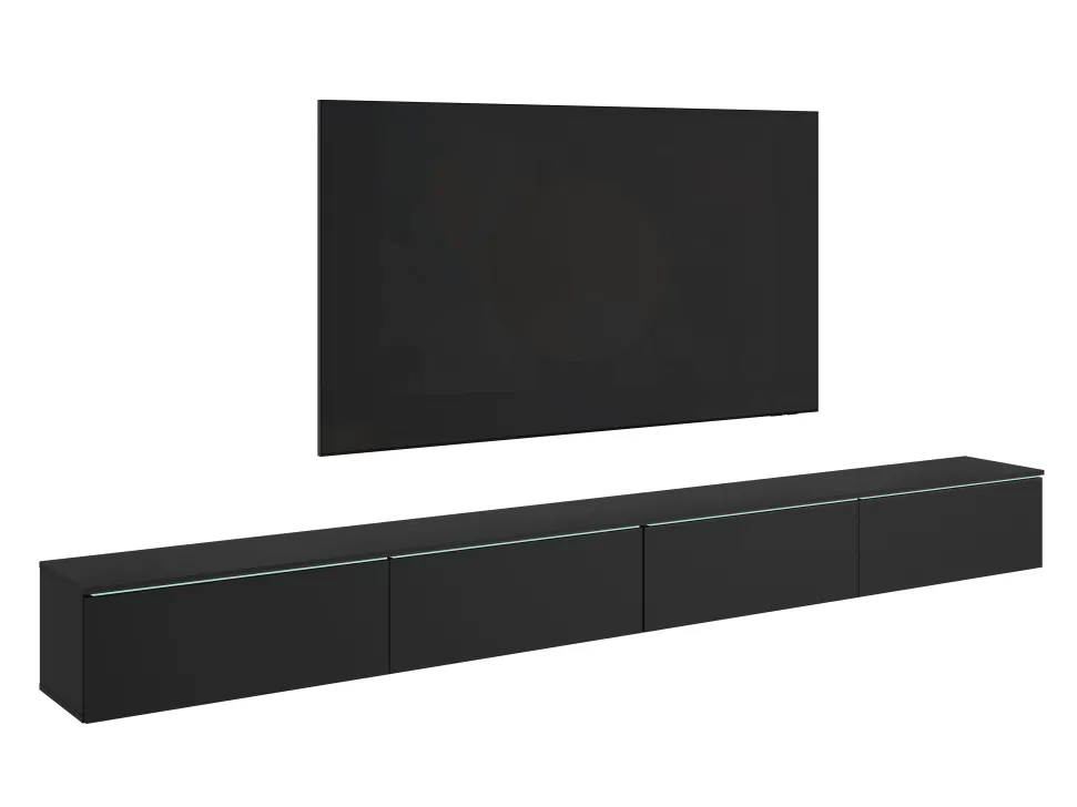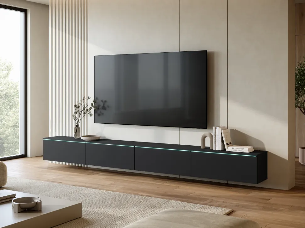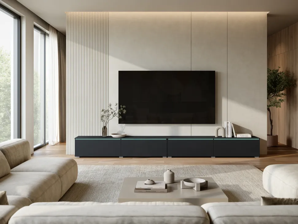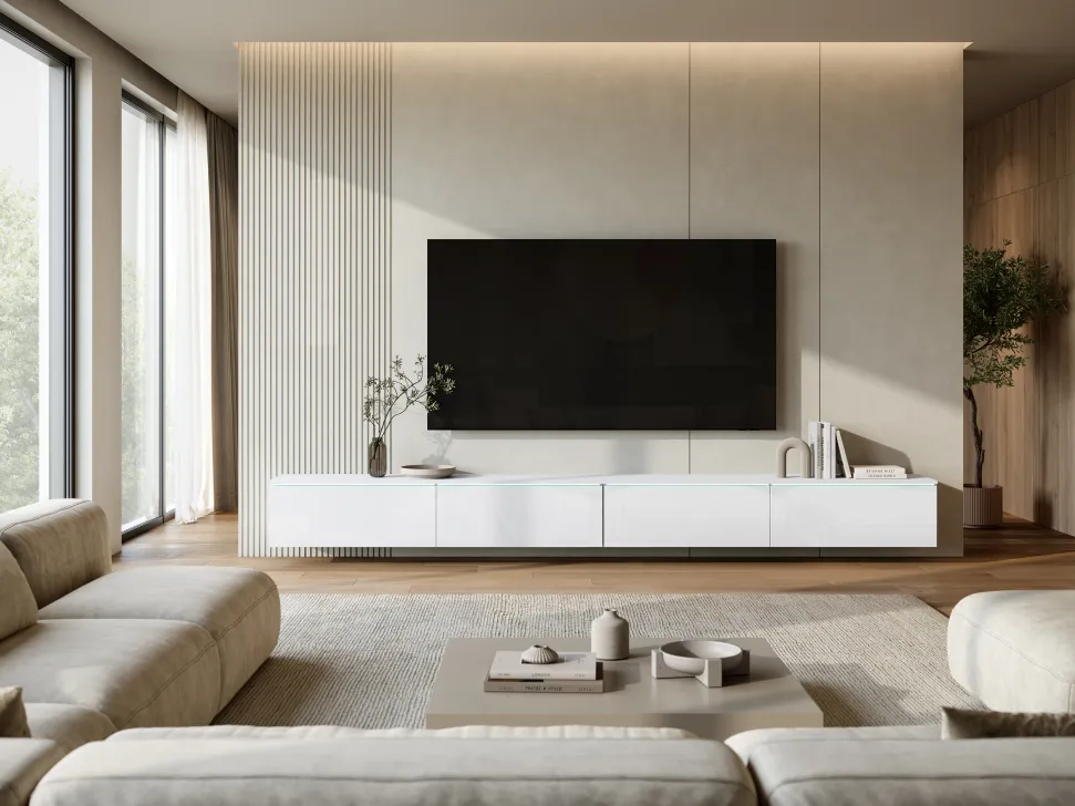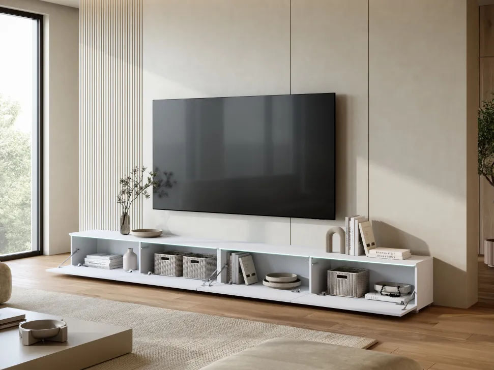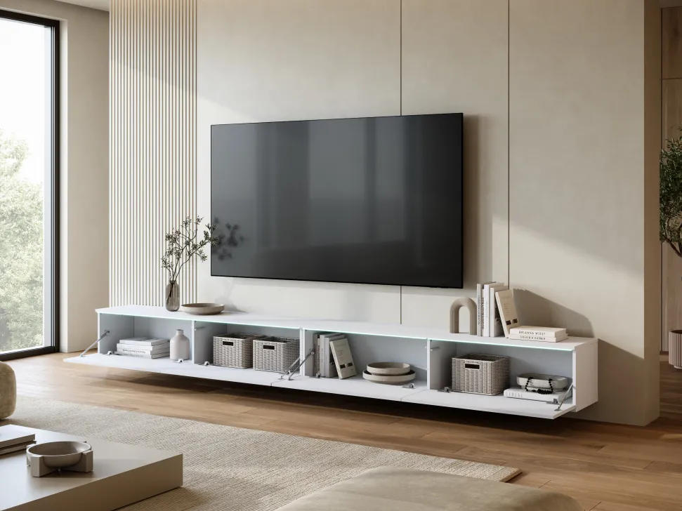 Ein moderner, minimalistischer TV-Schrank, der sich durch einen modularen Aufbau auszeichnet. Ein Möbelstück mit klaren Linien, ideal für die Einrichtung von Räumen in jedem Stil, das sich deren Charakter anpasst. Seine Vielseitigkeit zeigt sich auch darin, dass er an der Wand aufgehängt oder klassisch auf Füßen aufgestellt werden kann. Die hängende Variante verleiht dem Raum Leichtigkeit und erleichtert die Ordnung beim Bodenwischen. Der Schrank ist mit einer LED-Beleuchtung ausgestattet, deren sanft gestreutes Licht eine gemütliche Atmosphäre schafft. Das grifflose Öffnungssystem der Fronten unterstreicht die geometrische Form des Möbelstücks.