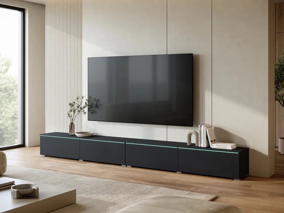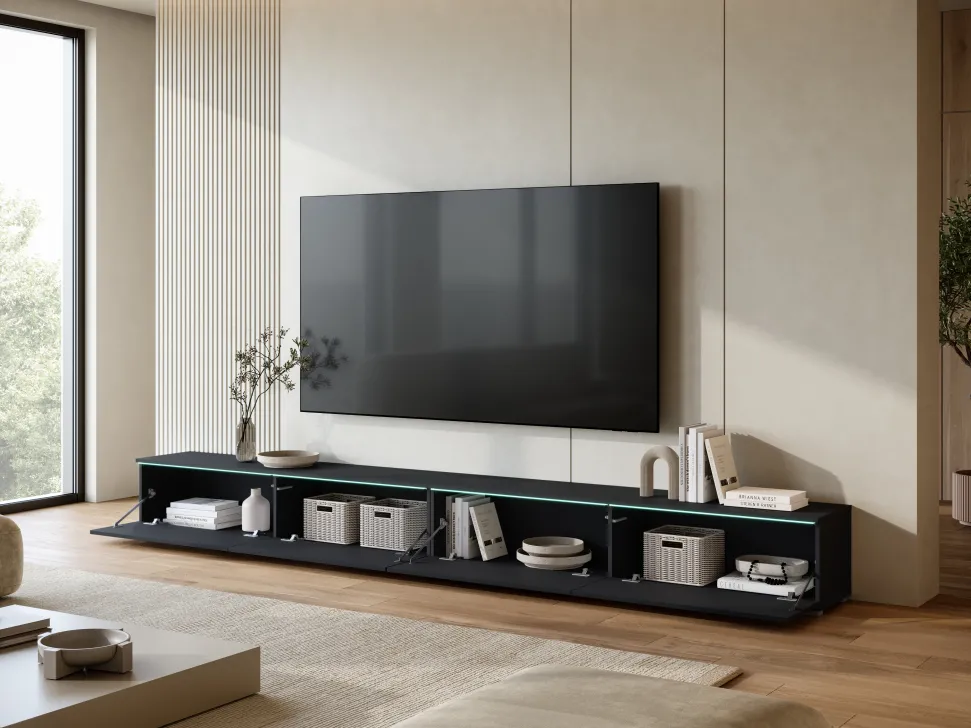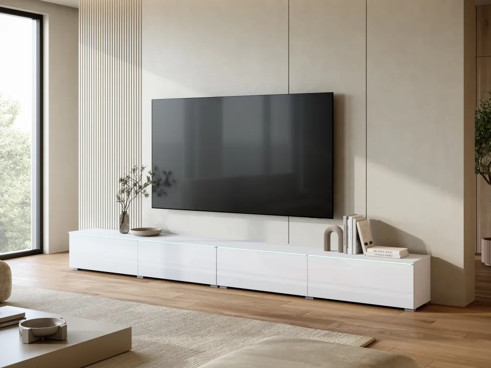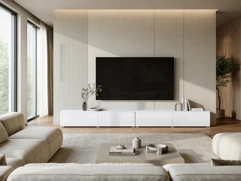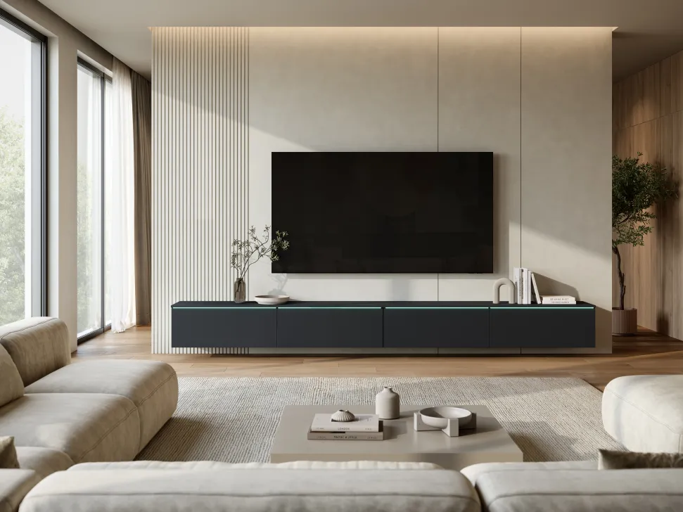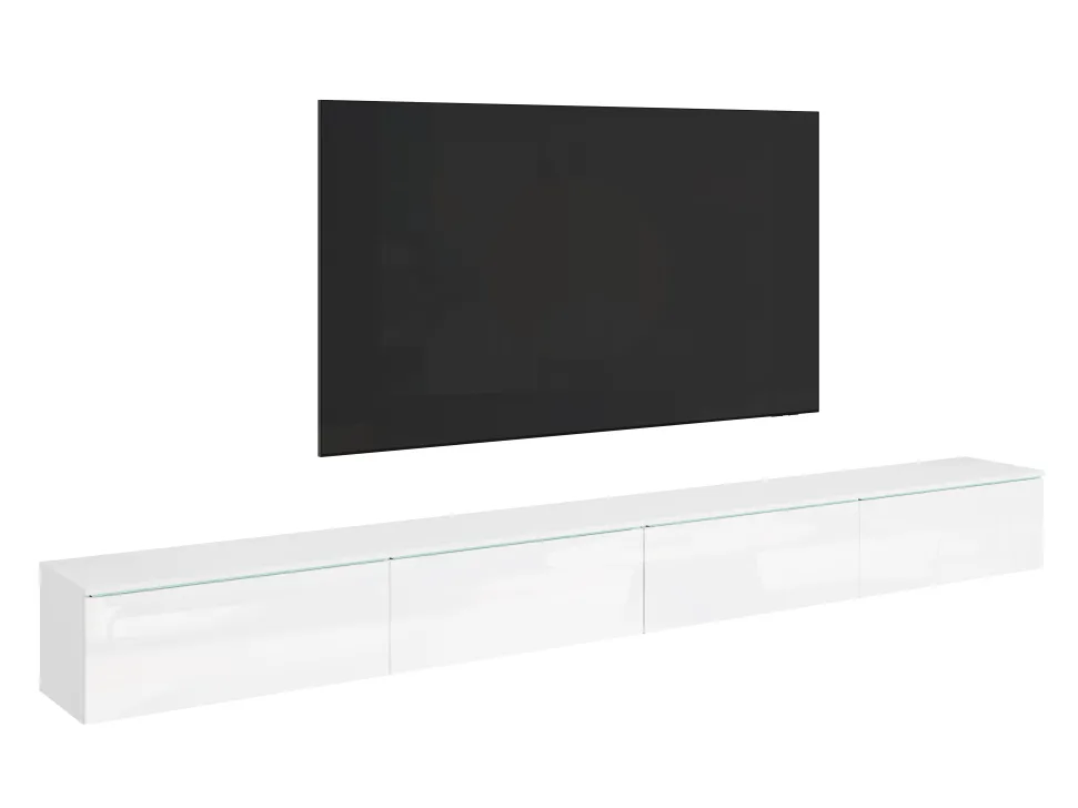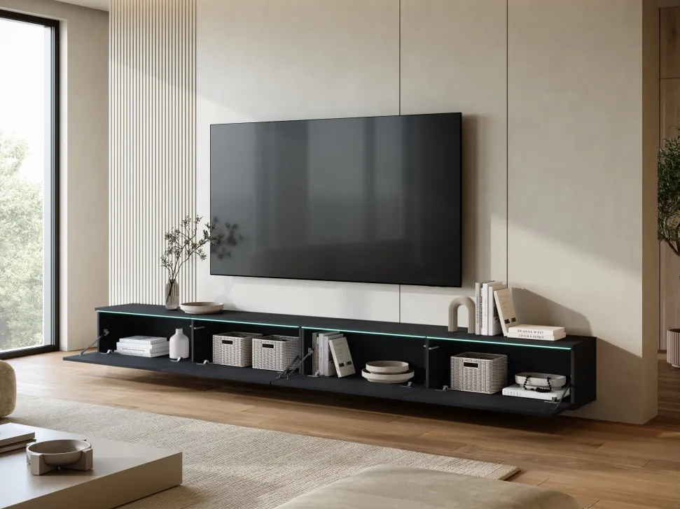 Ein moderner, minimalistischer TV-Schrank, der sich durch einen modularen Aufbau auszeichnet. Ein Möbelstück mit klaren Linien, ideal für die Einrichtung von Räumen in jedem Stil, das sich deren Charakter anpasst. Seine Vielseitigkeit zeigt sich auch darin, dass er an der Wand aufgehängt oder klassisch auf Füßen aufgestellt werden kann. Die hängende Variante verleiht dem Raum Leichtigkeit und erleichtert die Ordnung beim Bodenwischen. Der Schrank ist mit einer LED-Beleuchtung ausgestattet, deren sanft gestreutes Licht eine gemütliche Atmosphäre schafft. Das grifflose Öffnungssystem der Fronten unterstreicht die geometrische Form des Möbelstücks.