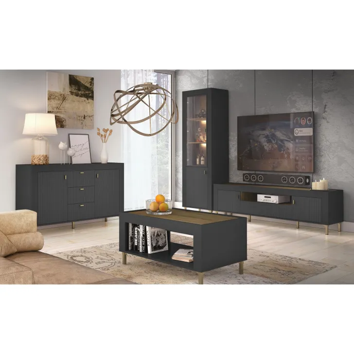 Blicke auf die Vitrine Asso 3, die mit ihrer Modernität und Großzügigkeit fasziniert. Ein wahres Kunstwerk, das nicht nur durch sein Design überzeugt, sondern auch durch seine Alltagstauglichkeit – perfekt geeignet für Wohnzimmer, Esszimmer oder Büro, wo es Komfort und Eleganz vereint.