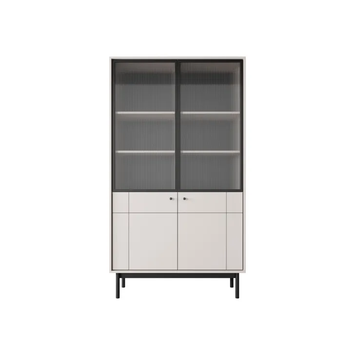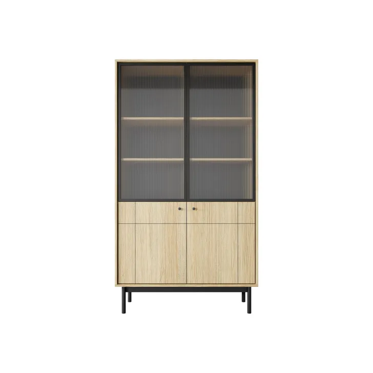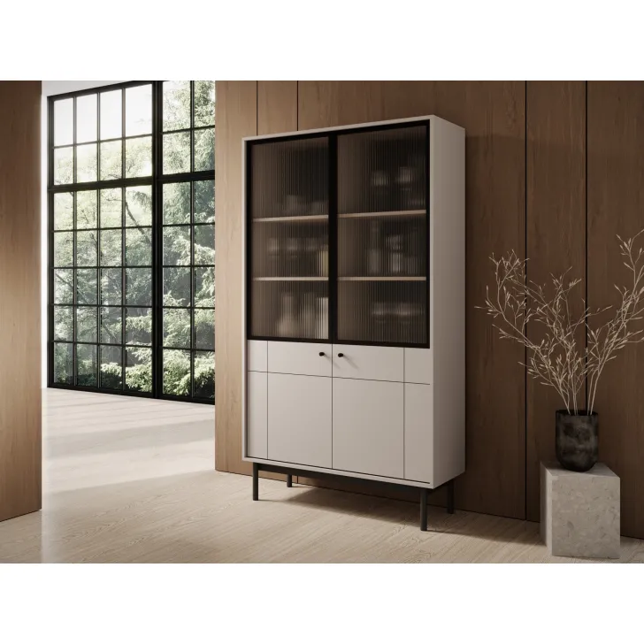 Die JUKON-Vitrine zeichnet sich durch ein schlichtes, minimalistisches Design aus, das von der skandinavischen Ästhetik inspiriert ist. Die feinen Rillen an den Fronten, die auf klaren Linien basieren, verleihen dem Möbelstück einen einzigartigen Charme. Darüber hinaus betonen die zwei verfügbaren Farbvarianten – Eiche Linea und Kaschmir – den Charakter der Vitrine und lassen sie sich perfekt mit unterschiedlichsten Einrichtungsstilen kombinieren.