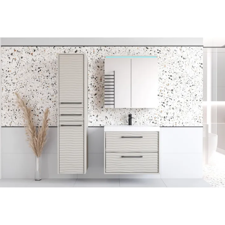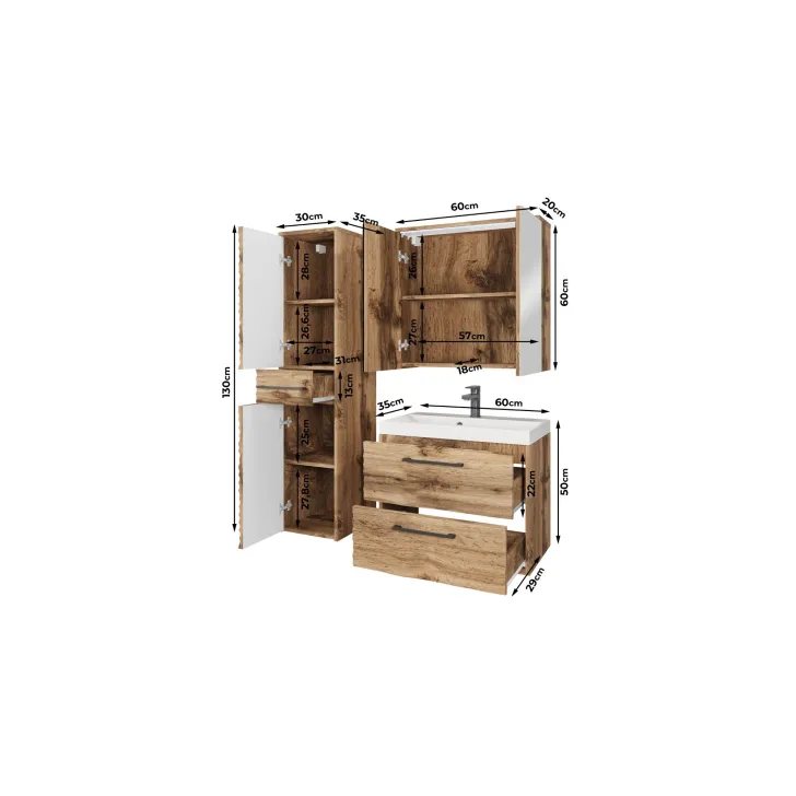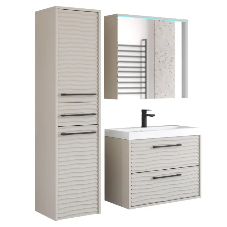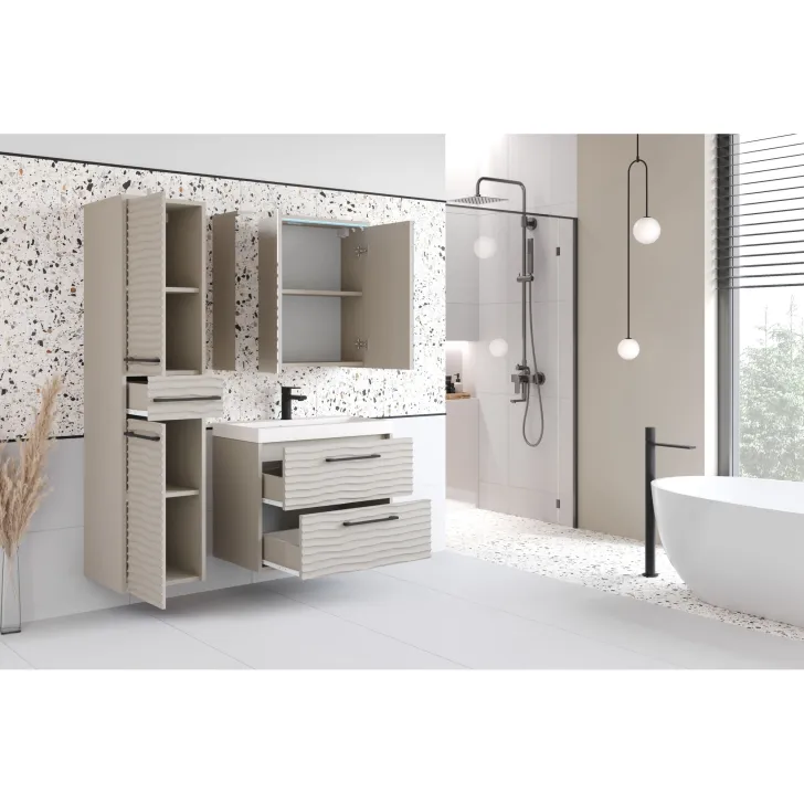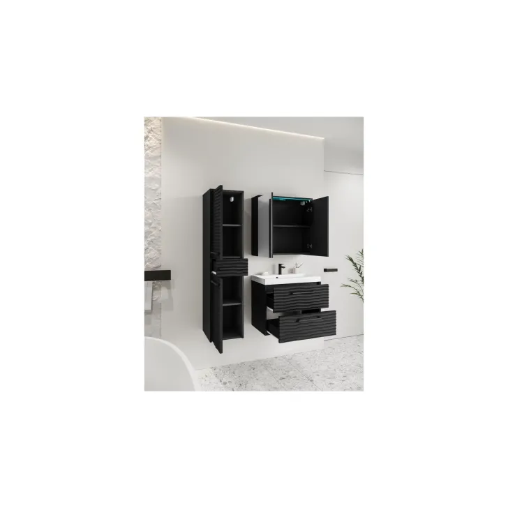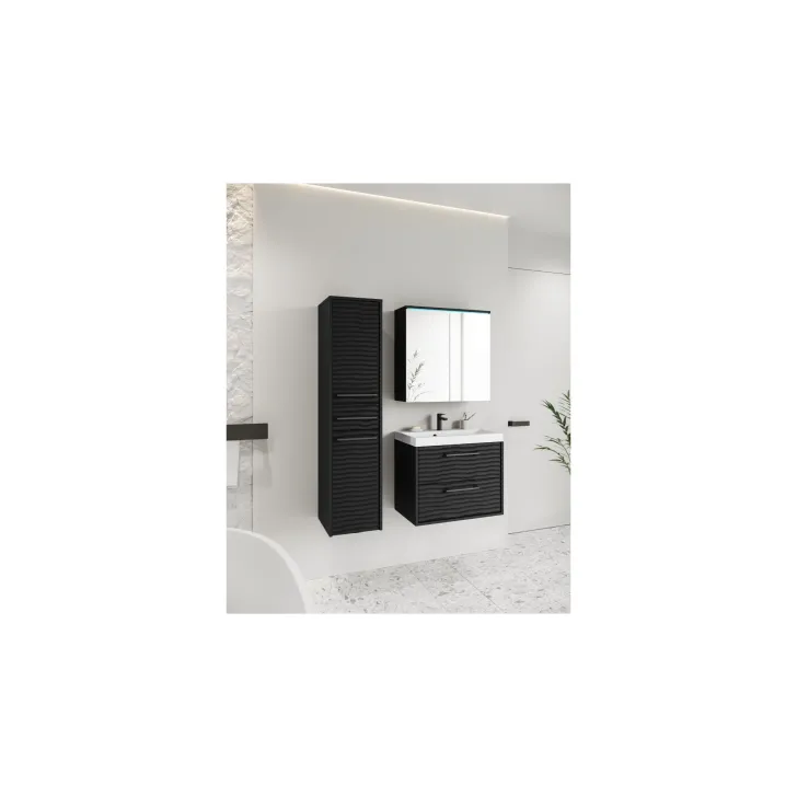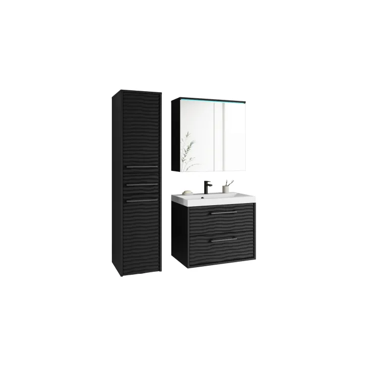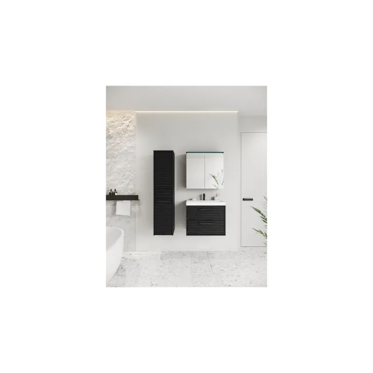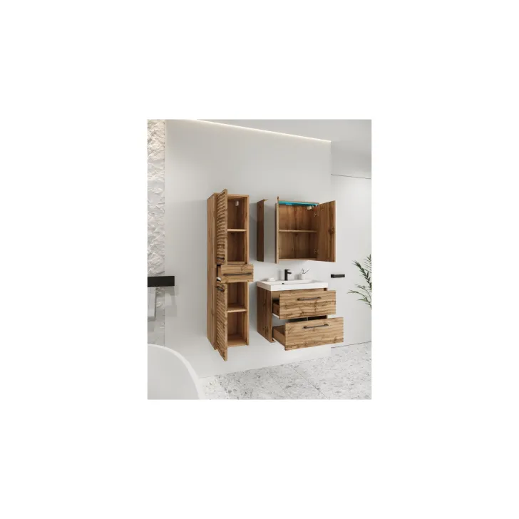 Badezimmermöbel „YUKO“ mit Waschbecken sind ein perfektes Set, das Ihnen eine elegante und funktionale Lösung für Ihr Badezimmer bietet. Das Set besteht aus hängenden Badezimmermöbeln, die sich durch zeitloses Design und hohe Verarbeitungsqualität auszeichnen. Die Möbel sind aus 15 mm starker, laminierter Möbelplatte gefertigt, was Langlebigkeit und Stabilität garantiert. Die Fronten bestehen aus hochwertiger MDF-3D-Platte, die den Möbeln Eleganz und Stil verleiht.