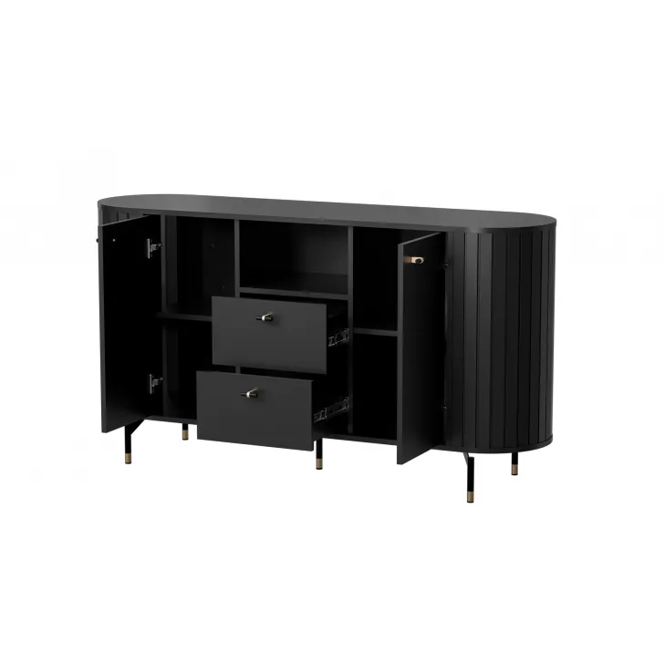 Die besonders filigranen Beine und Griffe in Schwarz-Gold unterstreichen das moderne, fast futuristische Design und verleihen dem Möbelstück gleichzeitig Stabilität und Sicherheit. Die Kommode ZAMA 2 zieht alle Blicke auf sich – ihre unverwechselbare Ästhetik wird garantiert geschätzt.