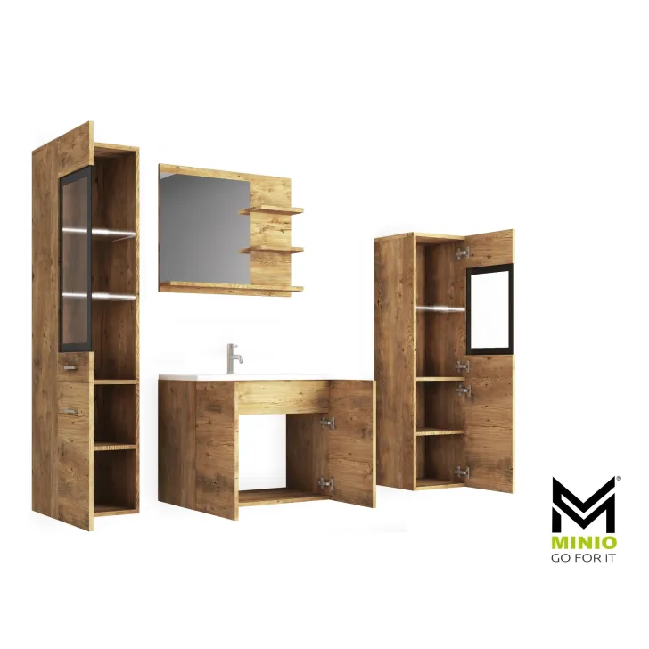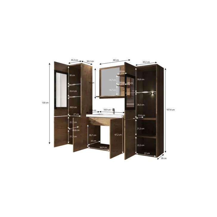 - Funktionalität: Das Set enthält alles, was Sie in Ihrem Badezimmer benötigen – Waschbecken, Schränke für Kosmetika und Hygieneartikel sowie einen Spiegel mit Ablagen.