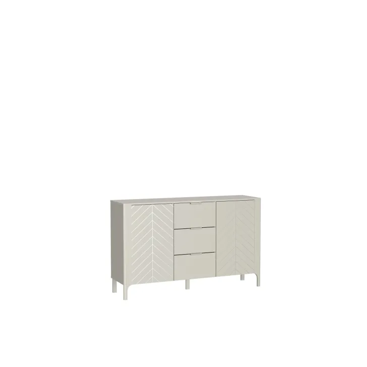 Gefertigt aus hochwertiger laminierter Platte, überzeugt die Kommode durch ihre Widerstandsfähigkeit und Langlebigkeit. Die Fronten mit einem eleganten Fischgrätenmuster verleihen dem Möbelstück ein besonderes Flair. Sie ist in zwei stilvollen Farbvarianten erhältlich – Schwarz Paintflow und Kaschmir – für ein warmes und einladendes Ambiente.