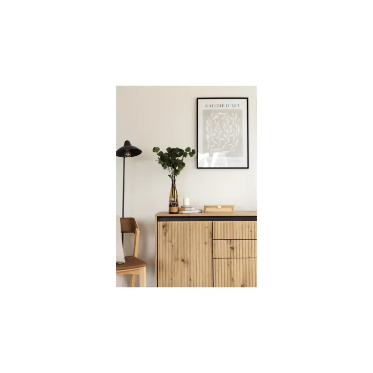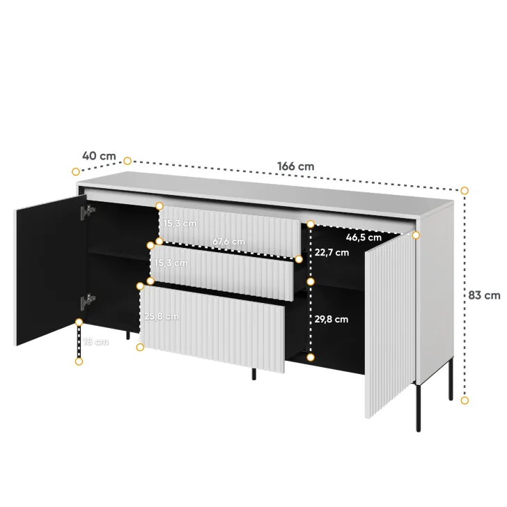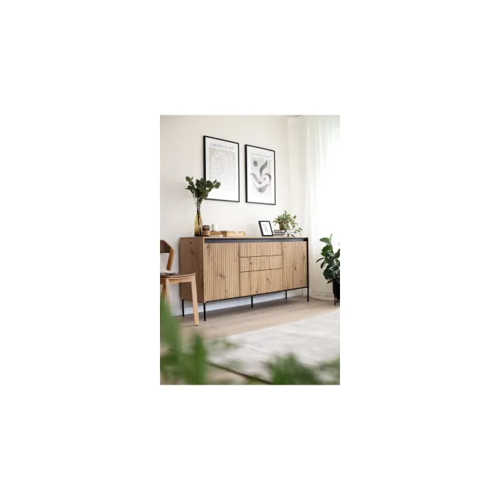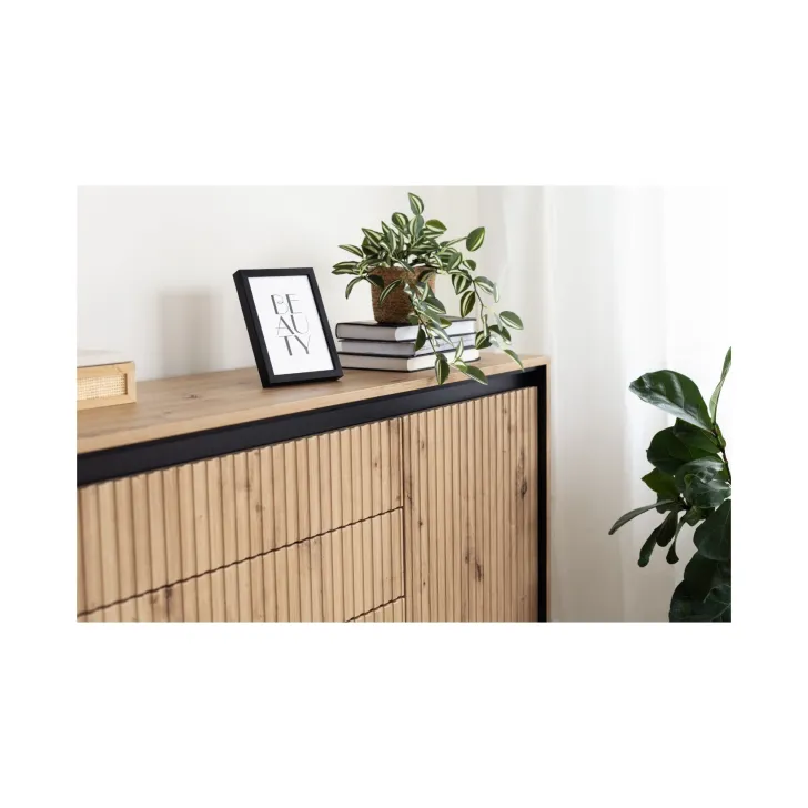 Und was halten Sie von der eleganten Riffelung der Fronten, der man einfach nicht widerstehen kann? Sie verleiht dem Möbelstück Charakter und betont zugleich die stilvolle LED-Beleuchtung. Die breite Oberplatte bietet den idealen Platz, um Dekorationen oder Accessoires zu präsentieren, die Ihrem Interieur zusätzlichen Charme verleihen.