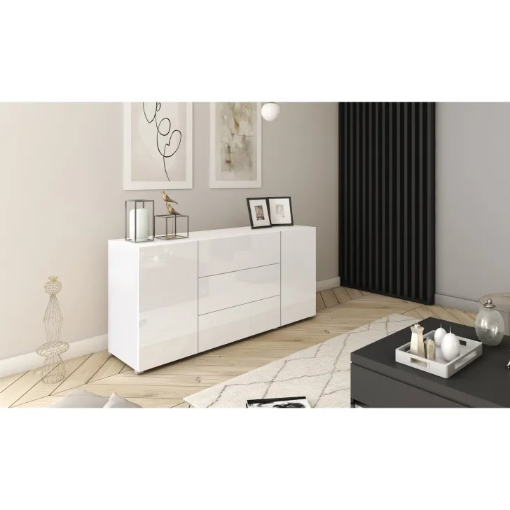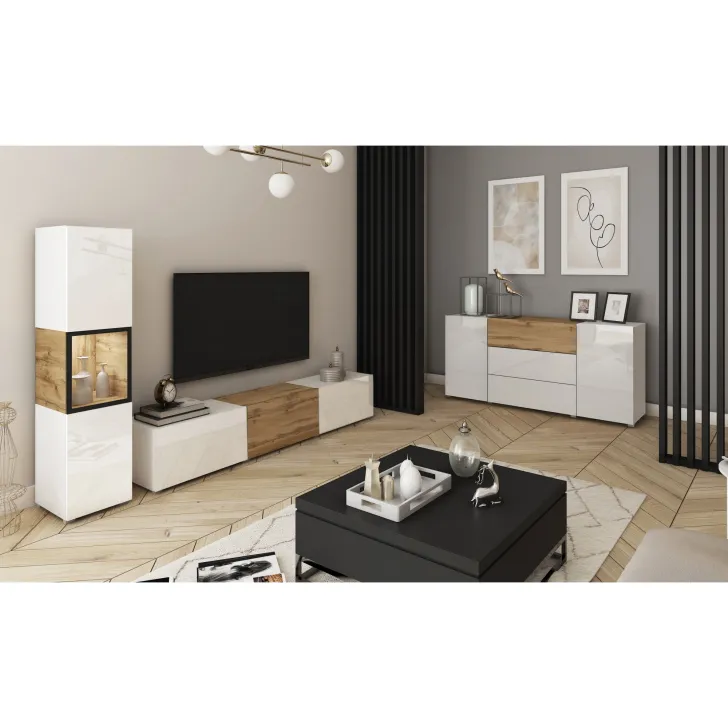 Erhältlich in vier Farbvarianten: Schwarz, Weiß/Weiß Hochglanz, Eiche Wotan/Schwarz sowie Weiß/Weiß Hochglanz/Eiche Wotan. Wählen Sie das Modell, das am besten zu Ihrem Wohnstil passt, und genießen Sie die Eleganz der BRELA-Kollektion.