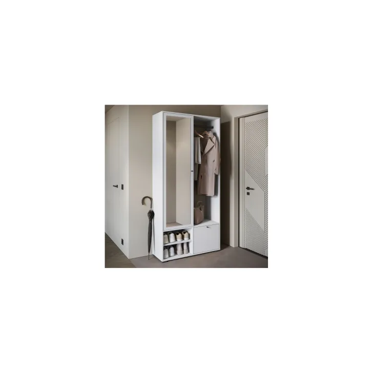 Das Herzstück der Garderobe bildet ein geräumiger Schrank mit breiten Regalböden für Kleidung, Accessoires oder Unterlagen. Integriert ist auch ein großer Spiegel, der das Raumgefühl optisch erweitert und den letzten Blick vor dem Verlassen des Hauses ermöglicht. Zusätzlich enthält das Set eine stabile Metallkleiderstange, zwei offene Fächer sowie einen praktischen Schuhschrank mit Klappfunktion.
