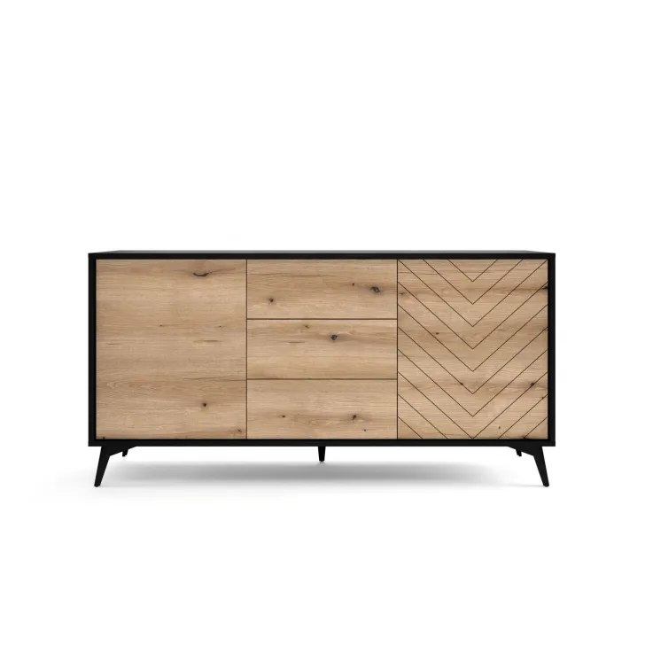 Die Kommode DIAMOND besteht aus hochwertiger, laminierter Platte, die sie widerstandsfähig gegen Kratzer und langlebig macht. Die angenehme Haptik des Materials sowie die einfache Reinigung machen sie besonders nutzerfreundlich. Darüber hinaus sind die Kanten mit ABS-Kantenband verstärkt, um sie vor mechanischen Beschädigungen zu schützen. Stabile Metallbeine verleihen der Kommode einen modernen Look und garantieren hohe Standfestigkeit.