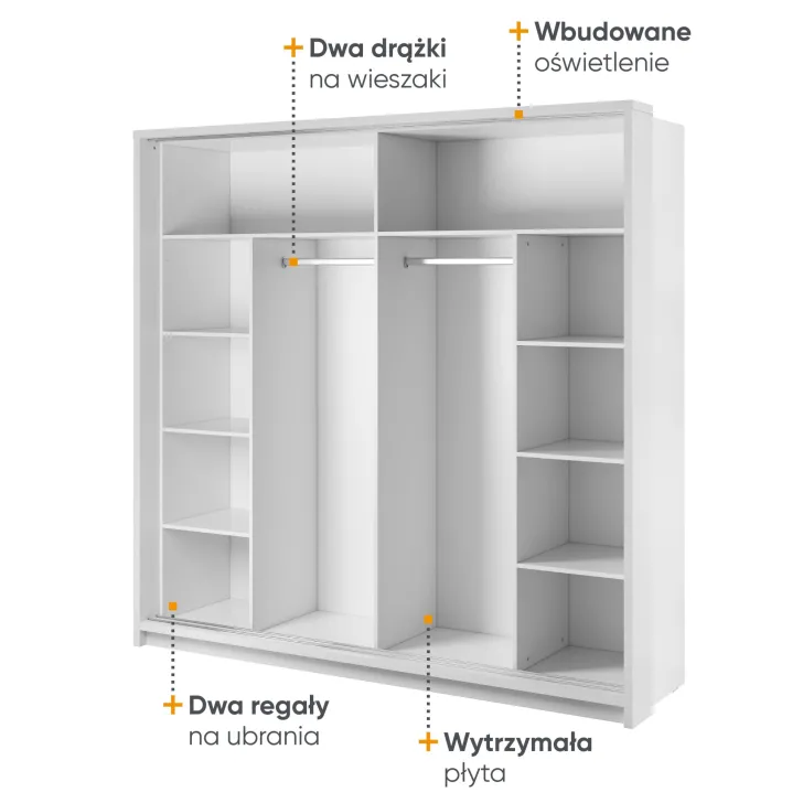 Der Kleiderschrank ERTA 14 Weiß kombiniert moderne Konstruktionslösungen mit hoher Funktionalität. Der Schrank aus der ERTA-Kollektion ist mit zwei Schiebetüren mit Spiegeln an der Front ausgestattet. Diese Lösung vergrößert den Raum optisch und ermöglicht es Ihnen, Ihr Erscheinungsbild bequem zu überprüfen und Ihre gesamte Silhouette zu betrachten. Im Inneren befinden sich zudem zwei Kleiderstangen sowie mehrere geräumige Einlegeböden, die eine ordentliche Aufbewahrung der Garderobe erleichtern.
