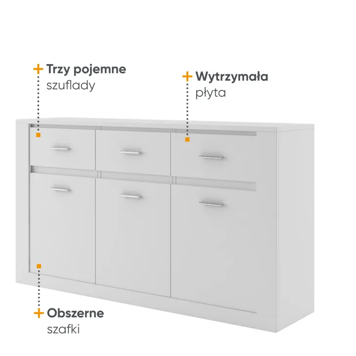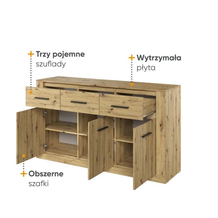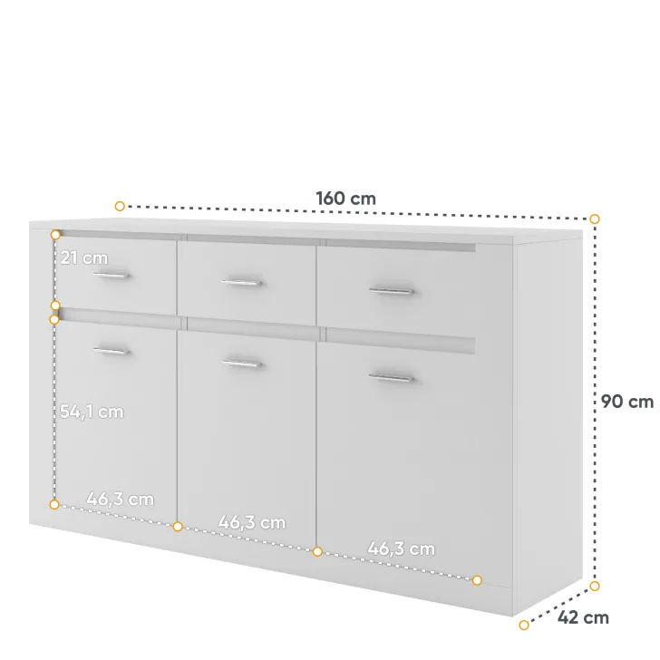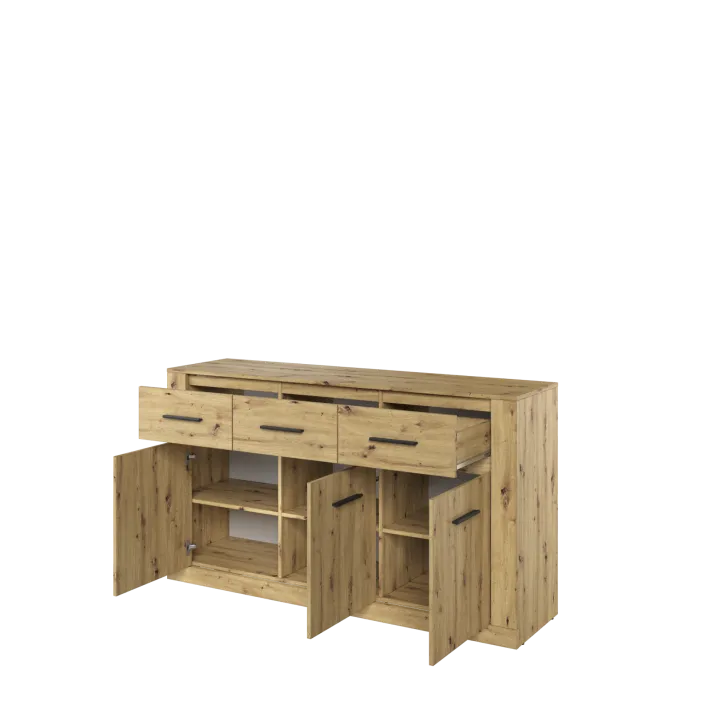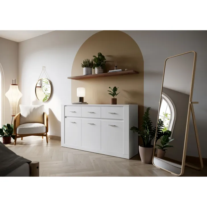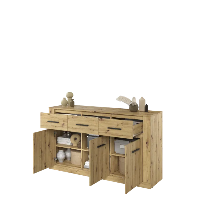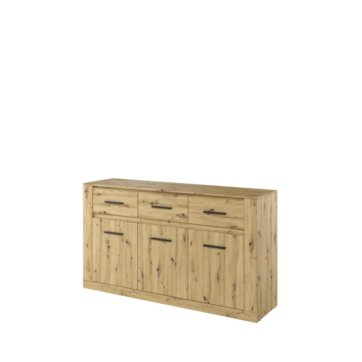 Die Kommode ERTA 9 ist ein besonders geräumiges Möbelstück, das den Anforderungen jedes Haushalts gerecht wird. Sie wurde mit dem Fokus auf maximale Funktionalität entworfen und bietet durch ihre drei Türen und drei Schubladen viel Platz für Kleidung, Unterwäsche und diverse Accessoires.