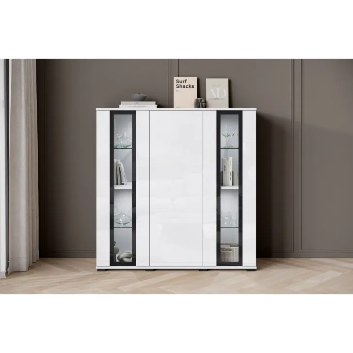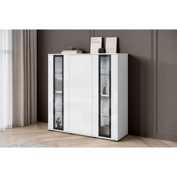Mit einem klaren Bezug auf modernes Design wird die Kommode FARO 120 cm zu einem unverzichtbaren Bestandteil der Einrichtung von Wohnzimmer, Essbereich oder Wohnraum. Ihre Funktionalität erfüllt höchste Ansprüche an ästhetische Aufbewahrung und dekorative Präsentation. Die raffinierte Kombination aus geschlossenen Schränken und verglasten Segmenten macht dieses Möbelstück zugleich stilvoll und praktisch. Dank ihres universellen Looks passt sich die Kommode problemlos an verschiedene Einrichtungsstile an – von klassisch bis modern. Optional erhältliche LED-Beleuchtung betont dezent die Inhalte der Vitrinen und sorgt für eine angenehme Atmosphäre.