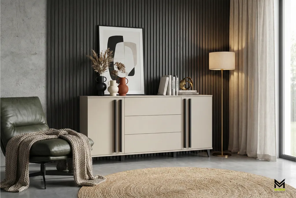 Das ausgeklügelte Design der Kommode HURON spiegelt ein zeitgemäßes Wohnkonzept wider. Die geometrische Form passt sich mühelos unterschiedlichen Einrichtungsstilen an und ist damit ideal für alle, die ein Möbelstück mit Charakter suchen. Das Push-to-Open-System an Türen und Schubladen mit lamellenartigen Griffen verleiht der Kommode eine elegante Leichtigkeit.