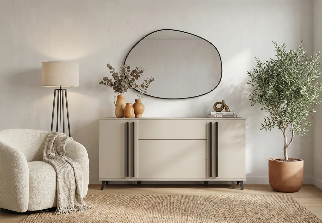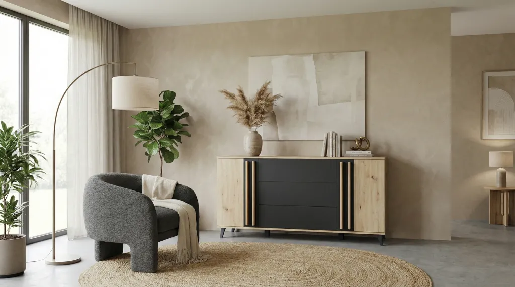 Dank durchdachter Innenaufteilung garantiert die HURON-Kommode maximale Funktionalität. Zwei geräumige Schränke mit Einlegeböden bieten ausreichend Platz für größere Gegenstände wie Akten, Alben oder Bücher. Drei Push-to-Open-Schubladen eignen sich ideal für kleinere Utensilien. Die Kommode hilft, den Alltag besser zu organisieren und lässt sich flexibel an Ihre Bedürfnisse anpassen.
