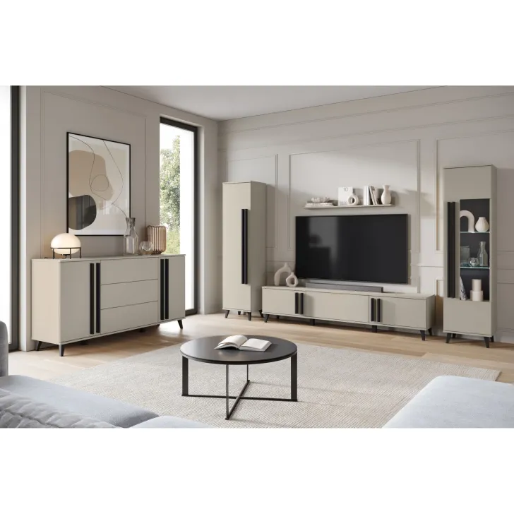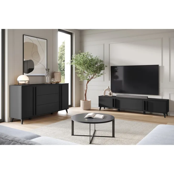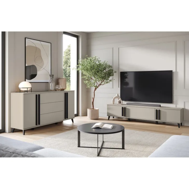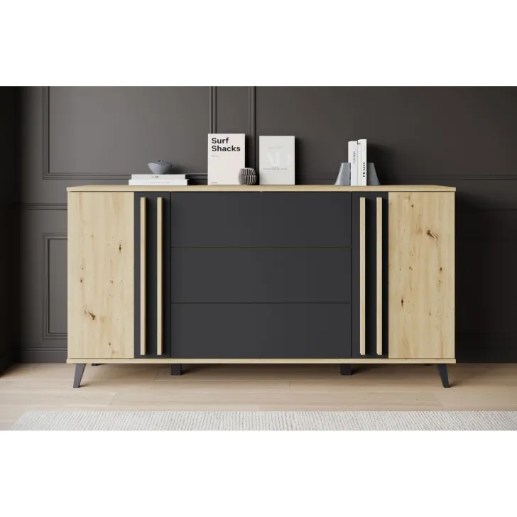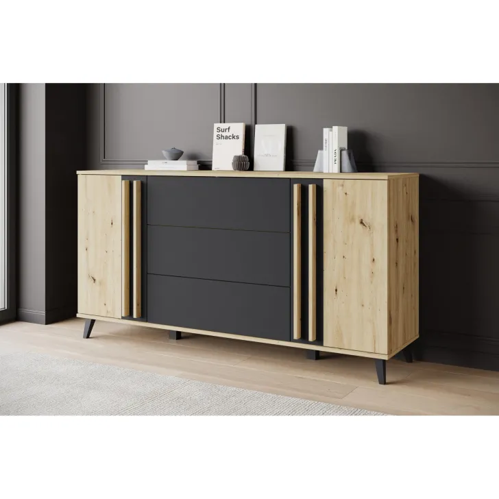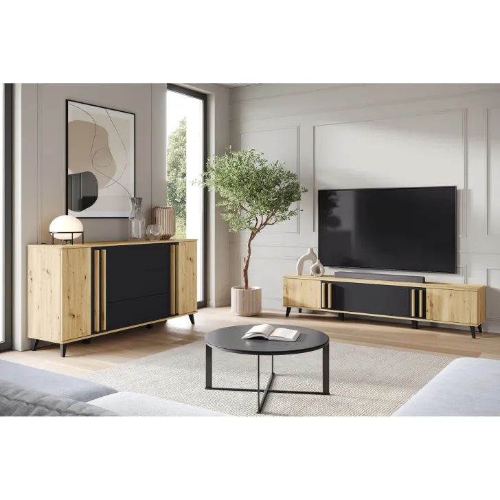 Bringen Sie mit der Kommode HURON 150 cm eine neue Dimension von Stil und Funktionalität in Ihr Wohnzimmer. Dieses hochwertige Möbelstück vereint modernes Design mit praktischer Aufbewahrungslösung. Die Kommode HURON bietet die perfekte Balance zwischen Ästhetik und Nutzen – mit einem markanten Look, der gleichzeitig stilvoll und funktional ist.
