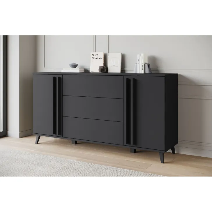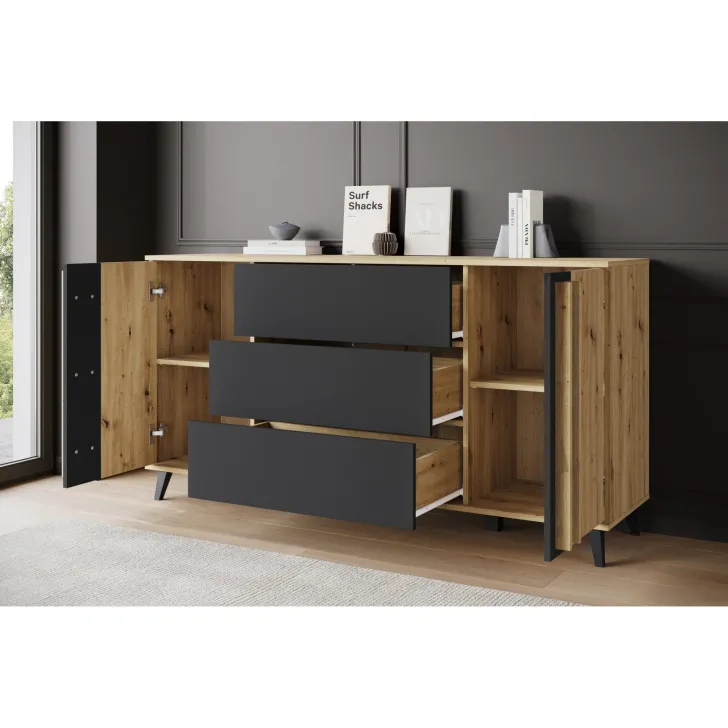 Gefertigt aus hochwertiger 15 mm starker laminierter Platte und mit 0,5 mm ABS-Kanten versehen, ist die HURON-Kommode ebenso robust wie stilvoll. Stabile Kunststofffüße gewährleisten sicheren Stand. Sie ist in drei modernen Farbvarianten erhältlich – Schwarz, Congo/Schwarz und Artisan-Eiche/Schwarz – und lässt sich so perfekt in jede Umgebung integrieren.