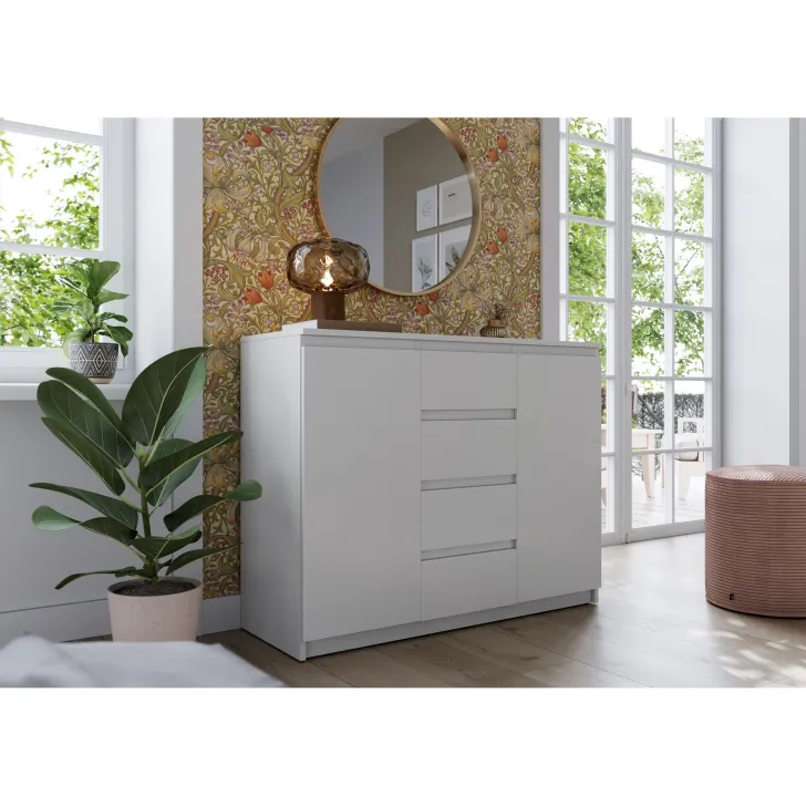 Die Kommode JADIA 4 wurde für anspruchsvolle Nutzer konzipiert, die funktionale Lösungen suchen. Sie kombiniert vier geräumige Schubladen mit zwei Türen, hinter denen sich praktische Einlegeböden befinden. Ideal zum Verstauen von Dokumenten, Kleidung, Schmuck oder anderen Haushaltsgegenständen. Die Oberplatte eignet sich perfekt zur Präsentation von Dekorationen, Fotos oder Accessoires, die den Charakter des Raumes betonen.