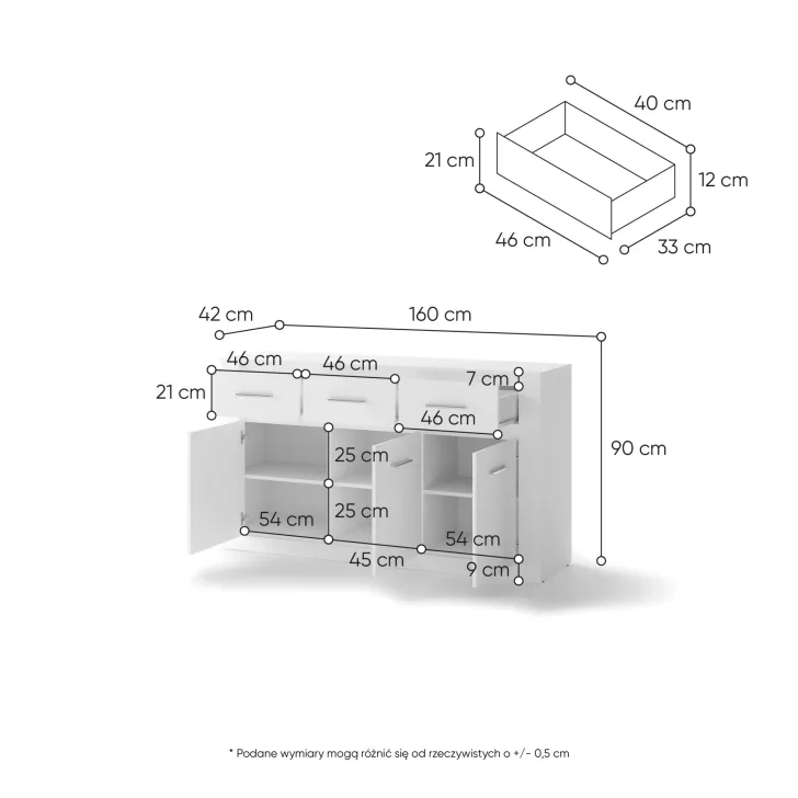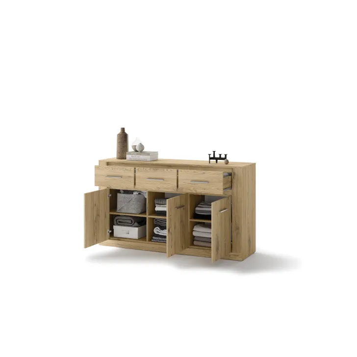 Sie ist mit drei geräumigen Schubladen und einer Tür ausgestattet, hinter der sich zusätzliche Einlegeböden verbergen. Dank ihres universellen Designs passt sie in jedes Zimmer – ob Wohnzimmer, Essbereich, Schlafzimmer oder Salon. Ein echtes Must-have für alle, die Funktionalität mit innovativem Stil verbinden möchten.