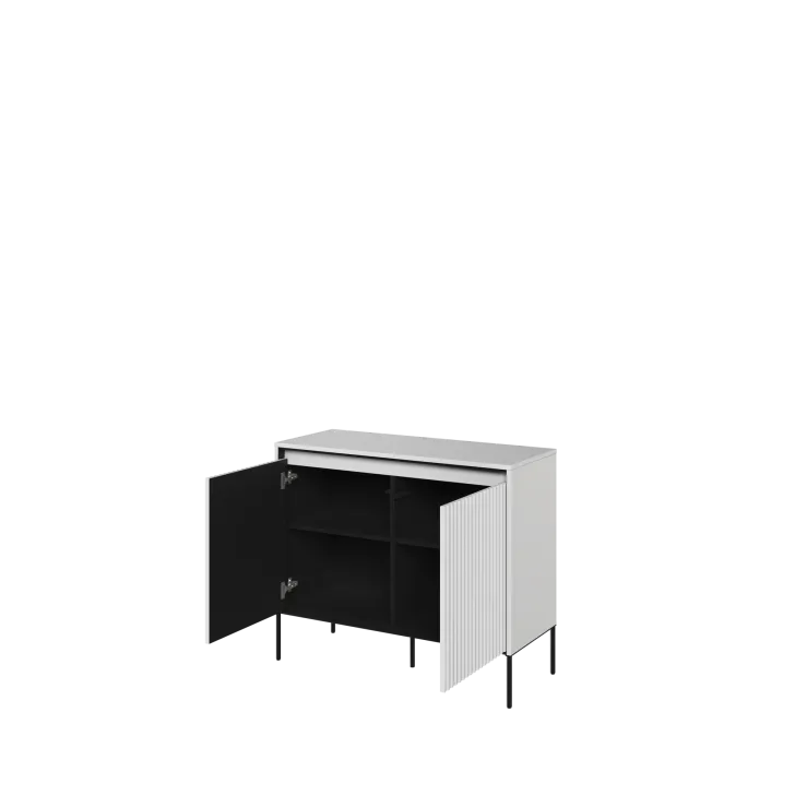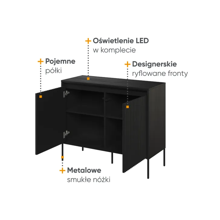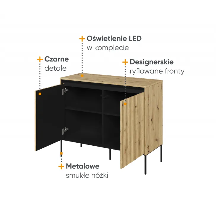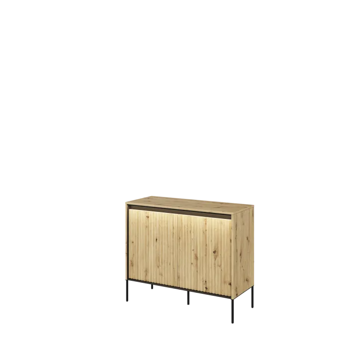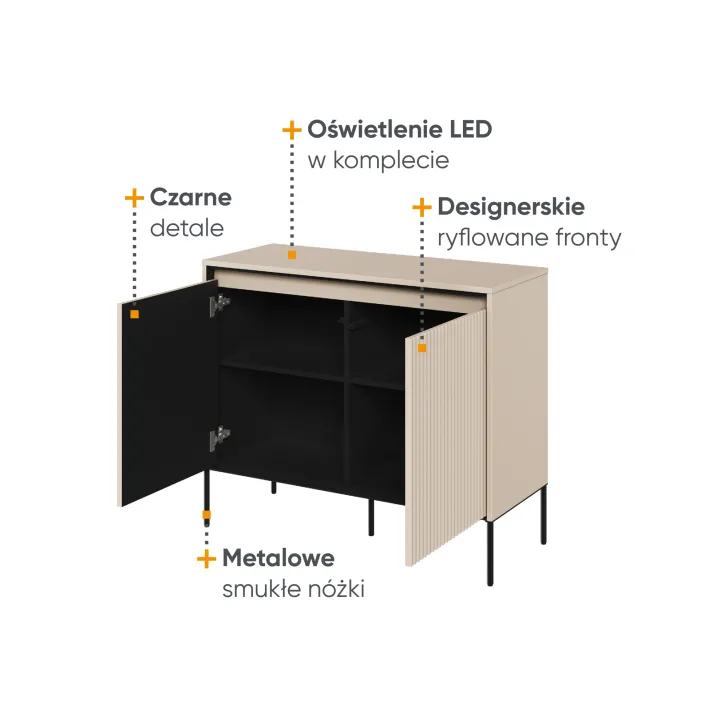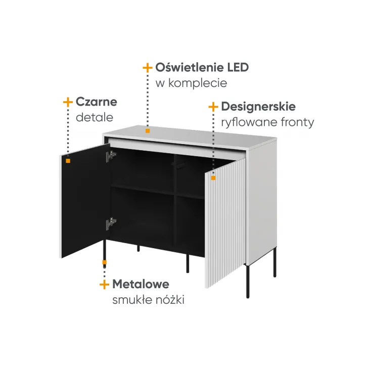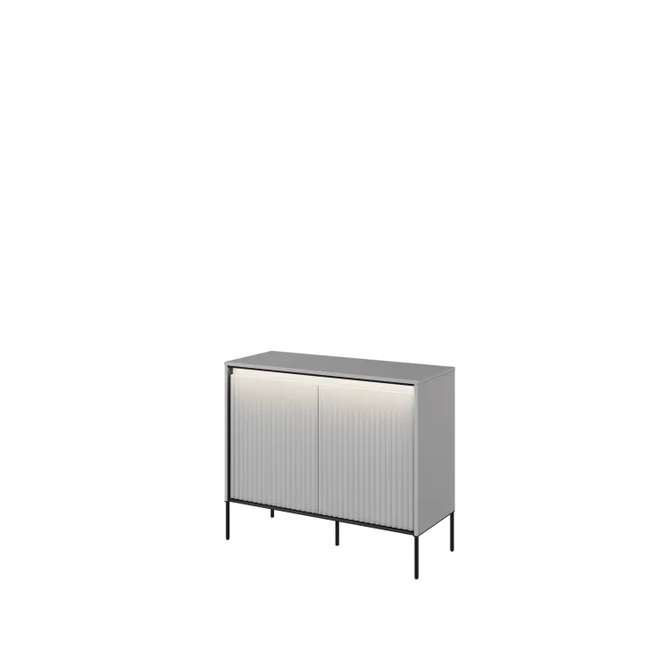 Das Design der Kommode besticht durch mehrere Details. Erstens durch die elegante Riffelung der Fronten, die perfekt mit der LED-Beleuchtung harmoniert. Zweitens durch die Oberplatte, die sich ideal eignet, um Dekorationen oder andere Accessoires stilvoll zu präsentieren. Eine großartige Lösung für alle, die Funktionalität mit Ästhetik verbinden möchten.