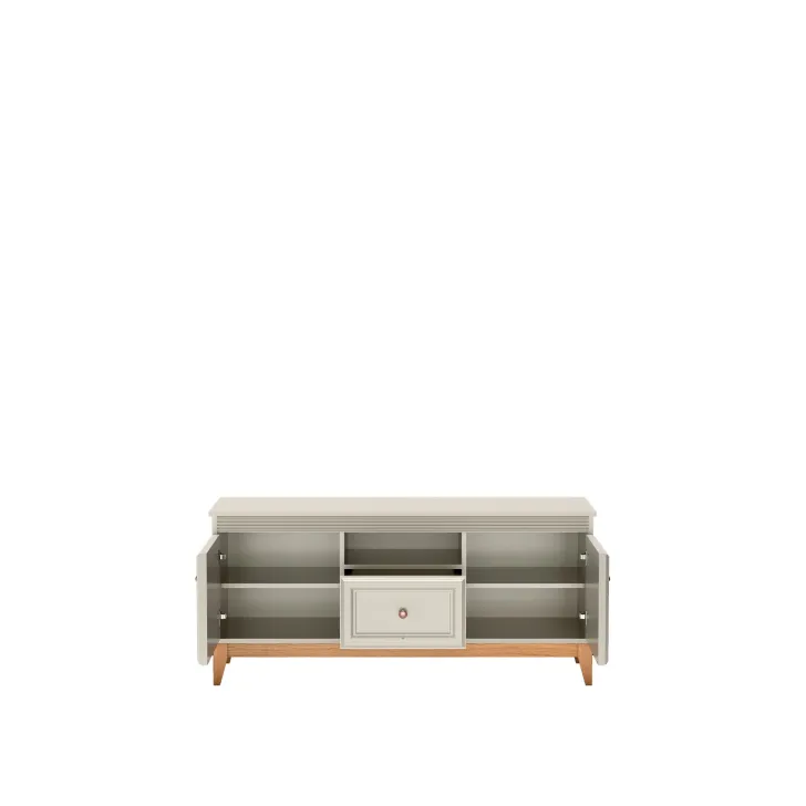 Wenn Sie Ihr Wohnzimmer funktional gestalten möchten, ist unser kleiner TV-Schrank DUBAI 8 die ideale Wahl. Er ist mit zwei Schränken mit Einlegeböden und einer Schublade ausgestattet, die ausreichend Stauraum für verschiedenste Accessoires bieten – von Fernbedienungen bis hin zu Brettspielen. Zusätzlich dient das offene Fach als perfekter Platz für Receiver oder Bücher, die Sie stets griffbereit haben möchten.