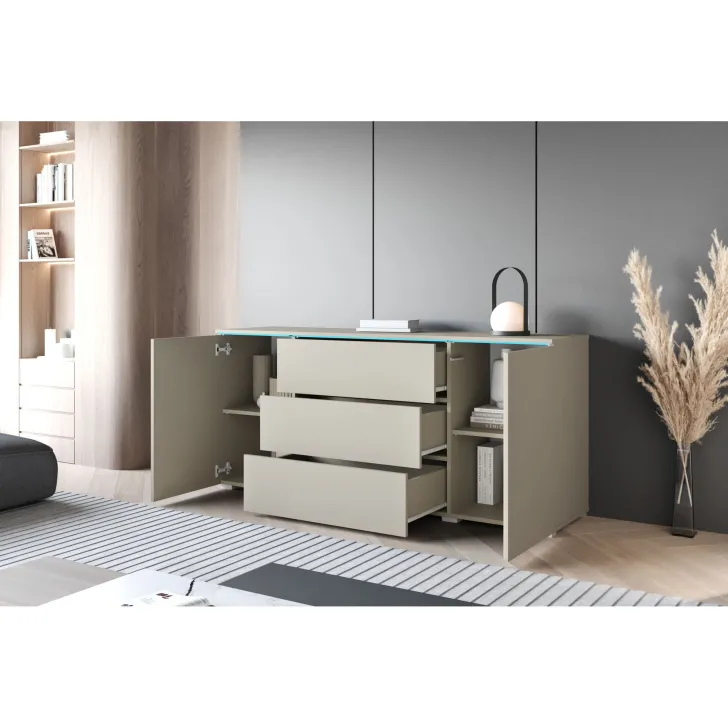 Das besondere Design der Kommode „VEVE“ 150 cm wird durch eine breite Farbpalette ergänzt, die sich perfekt in verschiedene Einrichtungsstile integrieren lässt. Verfügbare Farbkombinationen: