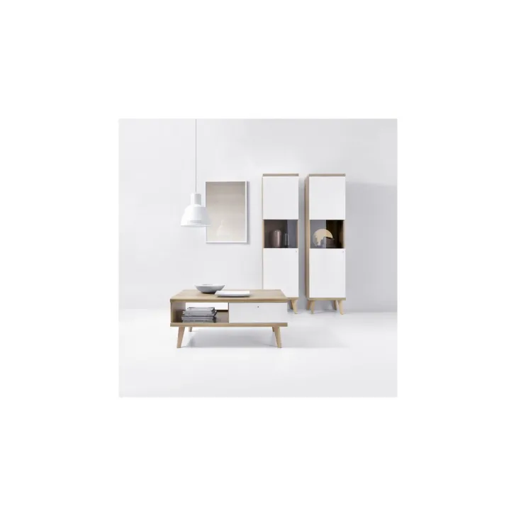 Der Couchtisch OSLO, gehalten im inspirierenden skandinavischen Stil, ist die perfekte Ergänzung für jedes Interieur. Das außergewöhnliche Design und die hohe Funktionalität machen dieses Produkt zu einem praktischen und eleganten Accessoire für Ihr Wohnzimmer. Die Farbgestaltung in Riviera Eiche und Weiß verleiht jedem Raum Eleganz und ermöglicht gleichzeitig ein komfortables Lese- oder Kaffeeerlebnis in entspannter Atmosphäre.