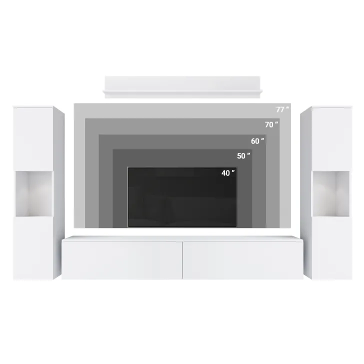 Das Set besteht aus vier funktionalen Teilen, die Komfort bieten und sich sowohl in kleineren als auch größeren Innenräumen perfekt integrieren. Zur Verfügung stehen offene Nischen, ideal um Ihre Lieblingsdekorationen zu präsentieren, sowie Schränke mit geräumigen Innenräumen, die eine komfortable Aufbewahrung verschiedener Arten von Gegenständen ermöglichen. Darunter befindet sich auch ein TV-Schrank, der zwei Fächer verbirgt, die hinter vollflächigen Türen verborgen sind und von oben nach unten in einem Klappmechanismus geöffnet werden.