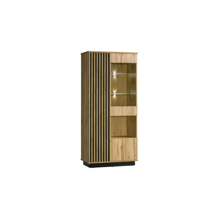 Die Ausstattung der Vitrine umfasst zwei Glasböden sowie zusätzliche Holzablagen, die ideal zur Aufbewahrung seltener genutzter Gegenstände sind. Gefertigt aus hochwertigen Materialien, garantiert diese Vitrine Langlebigkeit und Stabilität. Die Rückwand besteht aus solider HDF-Platte, während die Griffe aus Kunststoff dem Möbelstück einen modernen Charakter verleihen. Die Kombination aus MDF-Leisten und laminierter Platte sorgt für ein einzigartiges Zusammenspiel von Beständigkeit und Stil.